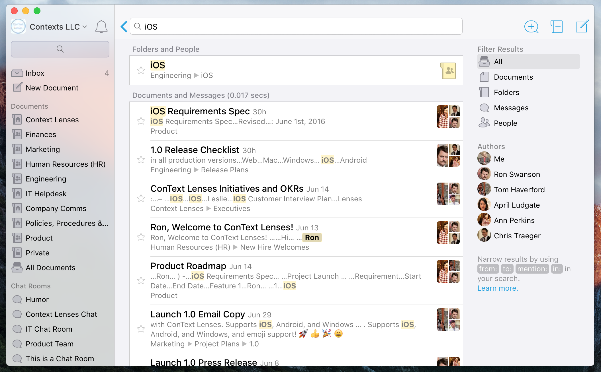 The simple full-screen search interface lets you toggle filters on and off to better hone in on the document you're looking for. You have the option to filter by content type and authors.