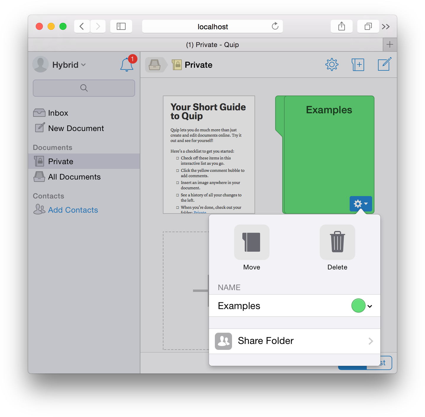 In addition to all these widgets popovers also often had custom validation logic (e.g. the “Create” button in the “New Folder” popovers is grayed out while the title is empty) and dynamic updates (rows representing users show presence). A declarative system would need to be quite complex in order to support all of these concepts. Furthermore, implementing each control multiple times was going to slow down development significantly, and the benefits seemed minimal (for example there are no platform conventions to follow for how to show a user row — that is a Quip-specific concept).