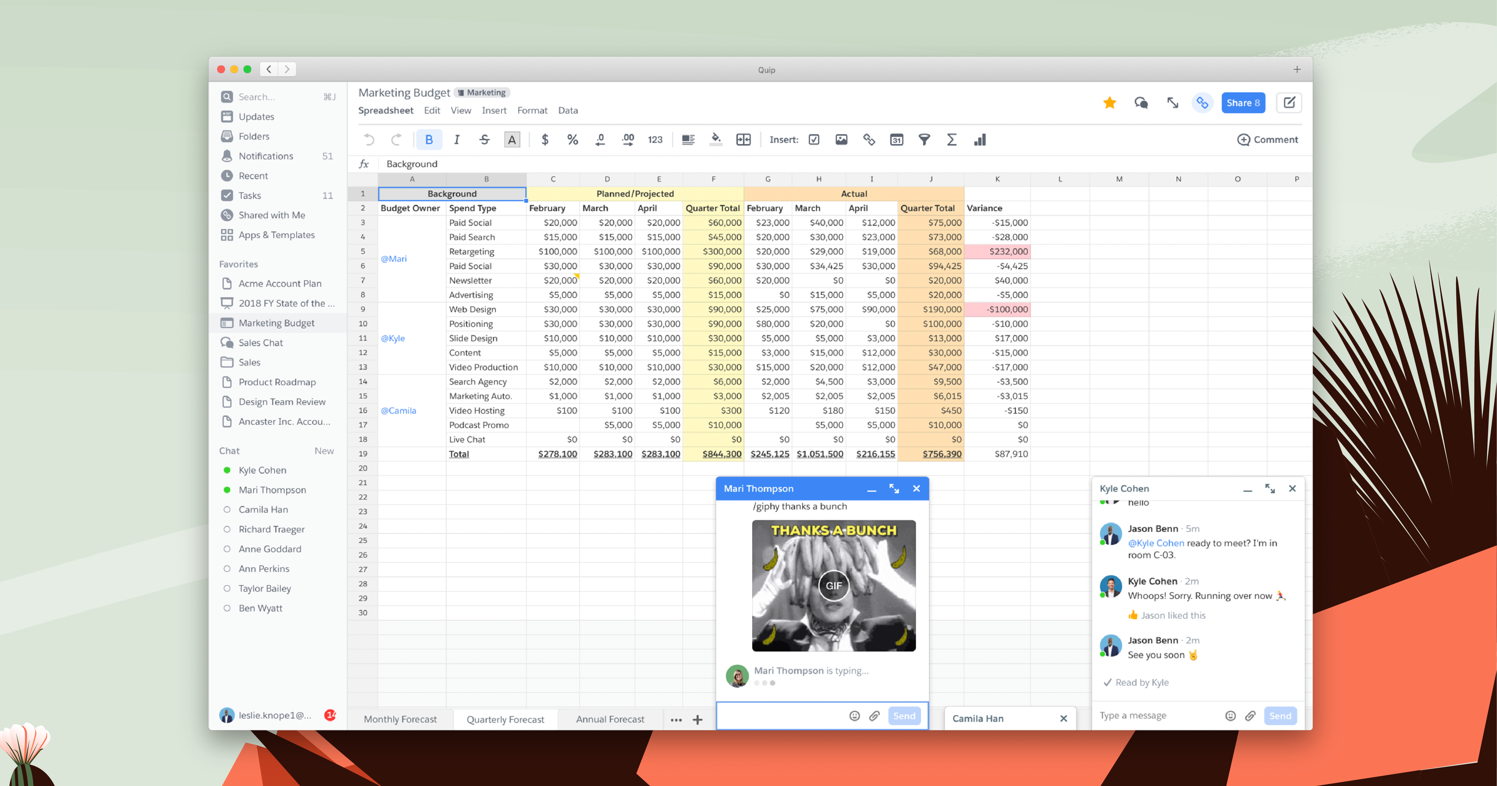 Quip's collaborative docs, spreadsheets, and slides get a lot of attention for having built-in chat, so teams can have real-time conversations in the context of their work. That's because we believe context is a key ingredient in our special sauce that helps teams be more productive together. When you don't have to jump between apps to get work done, you can stay focused and make decisions faster.